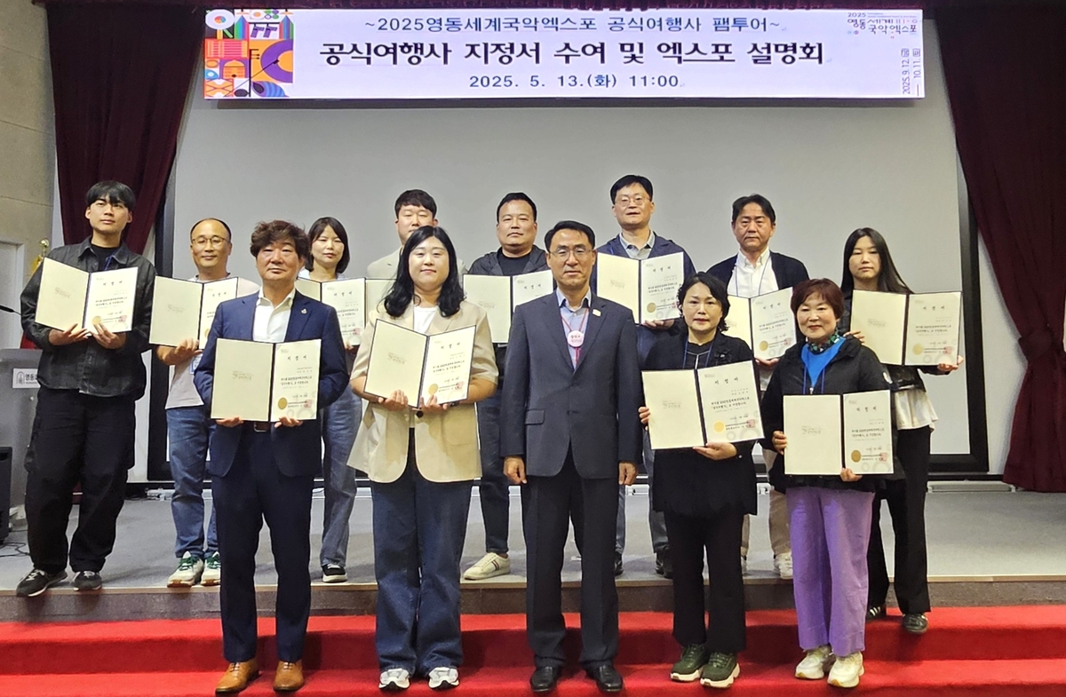 조직위는 지난 13일 공식 여행사 관계자 등에게 지정서를 주고, 엑스포 주무대인 레인보우힐링관광지와 국악체험촌을 비롯해 월류봉, 옥계폭포, 노근리평화공원, 와이너리 등을 둘러보면서 여행 상품을 기획하는 팸투어를 진행했다.