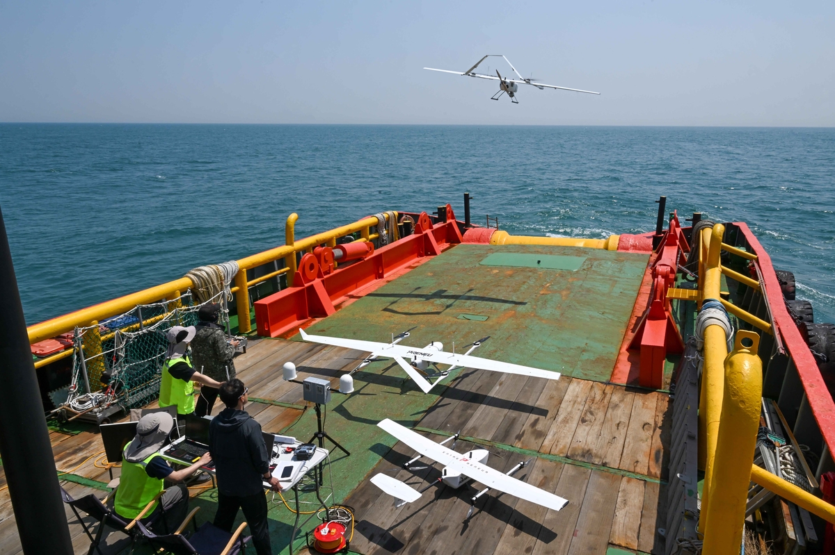 드론은 네 축 프로펠러에 의지해 천천히 수직으로 이륙한 뒤 고정 날개로 비행을 시작했다. 한 대는 해상표적이 있는 울산 바다를 향해, 다른 한 대는 지상 표적을 향해 날아갔다.