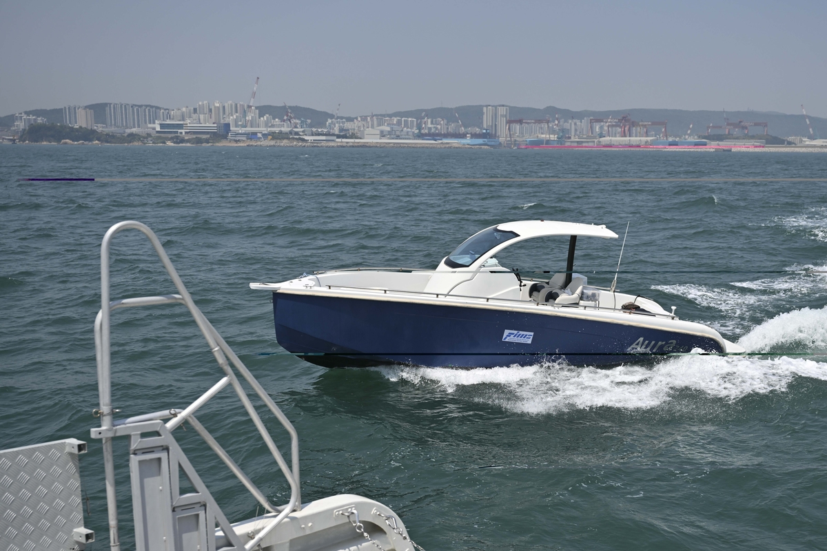 훈련에 참여한 무인수상정은 레저용으로 개발된 '아우라'로, 전장 8m 크기에 최대 시속 70㎞인 3t급 무인 요트다.