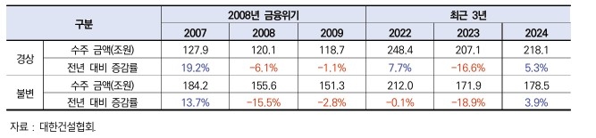 건설투자도 2022년과 2024년 각각 전년 대비 3.5%와 3.0% 감소해 2008년 감소폭인 2.7%를 웃돌았다.