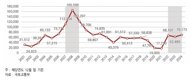 주택 수요 부진 지표인 연도별 미분양(12월 말 기준)은 2008년 16만5천599가구로 역대 최고치를 기록했고, 2022년에는 6만8천107가구로 물량 자체는 그보다 적지만 전년 대비 증가율은 284.6%로 매우 가팔랐다.
