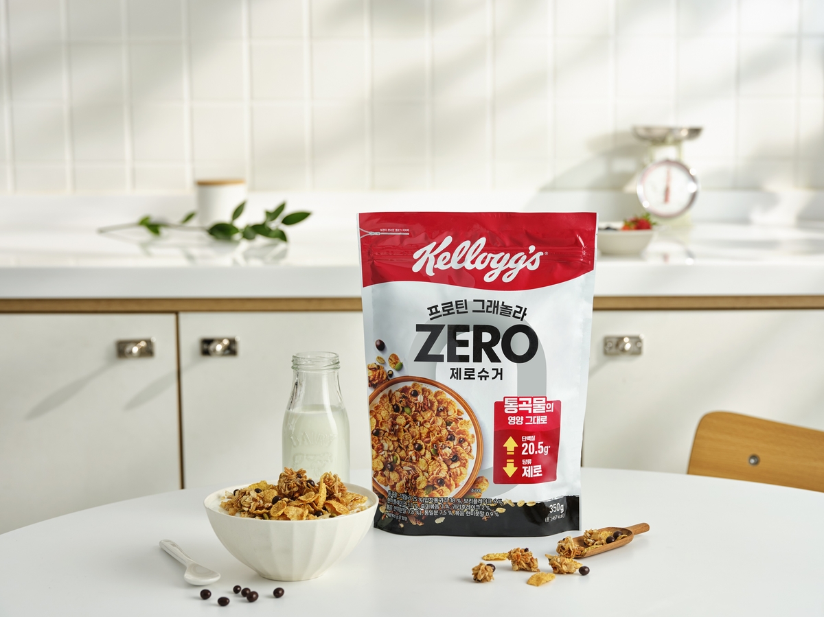 ▲ 농심켈로그는 '프로틴 그래놀라 제로슈거'를 내놨다. 통귀리와 현미, 흑미 등 당 함량이 낮은 통곡물로 그래놀라를 만들었고 설탕 대신 스테비아와 알룰로스 등 대체 감미료를 넣었다. 또 검은 약콩, 대두 단백질 등 식물성 원료로 단백질을 채웠다.