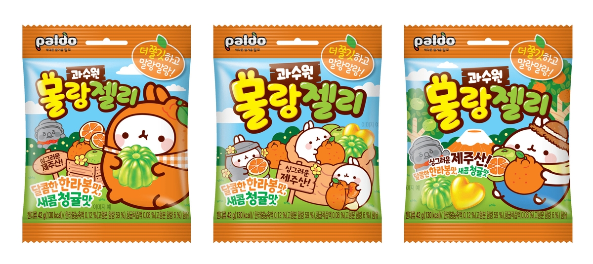 ▲ 팔도는 디저트 제품 '몰랑 과수원 젤리'를 내놨다. 한라봉과 청귤맛 젤리 2종을 한 팩에 담아 골라 먹는 재미를 더했다. 포장은 인기 캐릭터 '몰랑이'와 제주 관광명소, 특산물 등으로 디자인했다.
