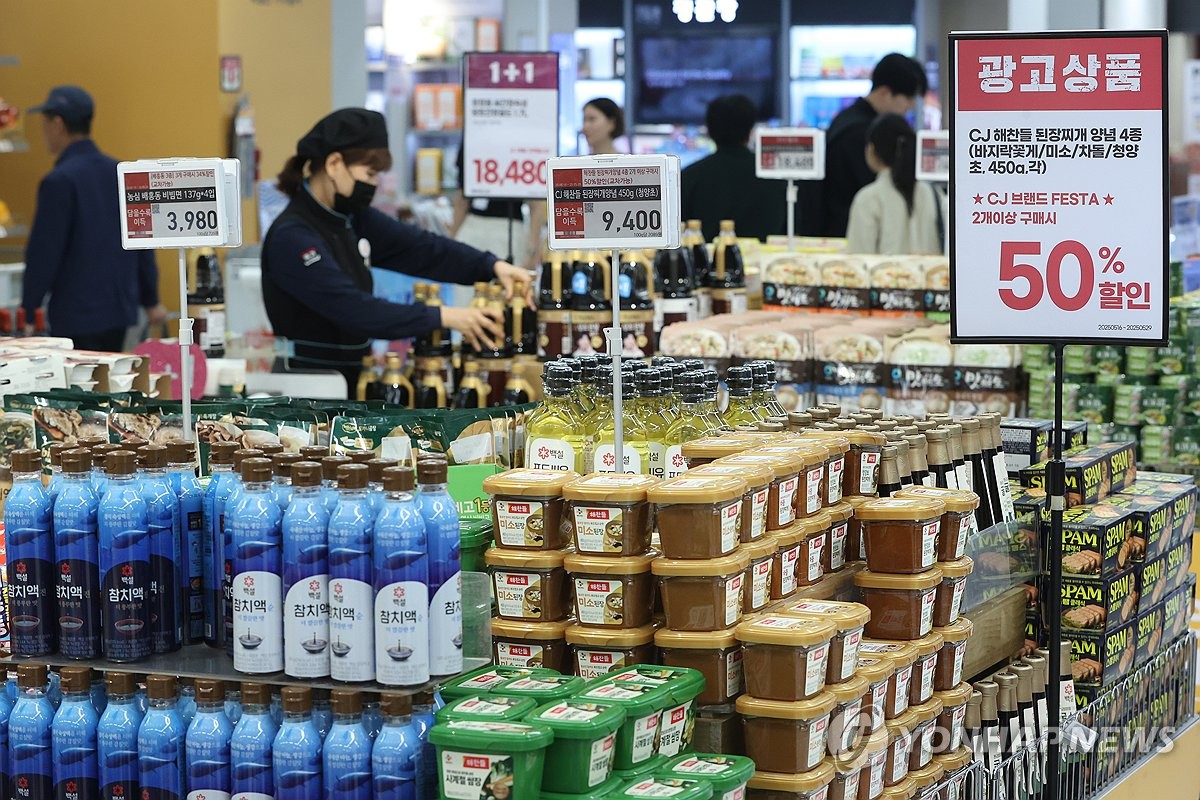 (서울=연합뉴스) 강민지 기자 = 국내 주요 식품기업들의 올해 1분기 대체로 영업이익이 감소한 것으로 나타났다. 재룟값과 원/달러 상승이 겹쳐 원가 부담이 커진 데다, 내수 침체로 국내 소비는 위축됐기 때문이다. 사진은 16일 서울의 한 대형마트에 진열된 식품류 모습. 2025.5.16 mjkang@yna.co.kr