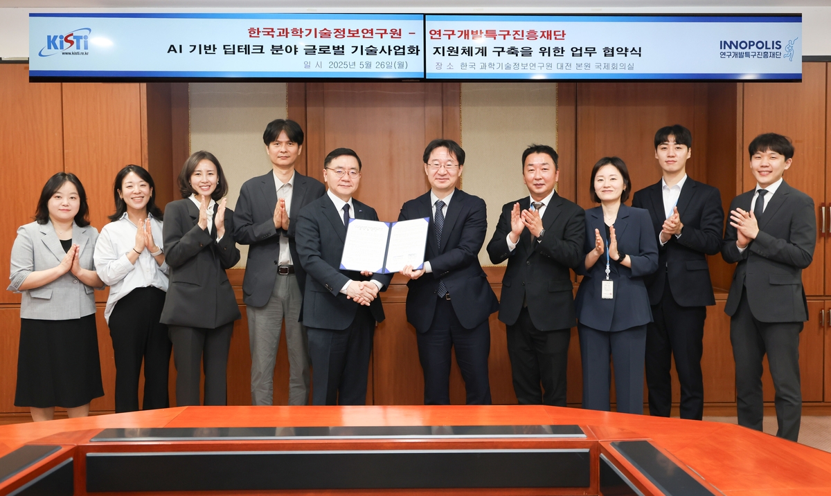 (대전=연합뉴스) 정찬욱 기자 = 연구개발특구진흥재단과 한국과학기술정보연구원(KISTI)은 26일 '인공지능(AI) 기반 딥테크(기반 기술) 분야 글로벌 기술사업화 지원체계 구축 업무협약(MOU)을 했다고 밝혔다.
