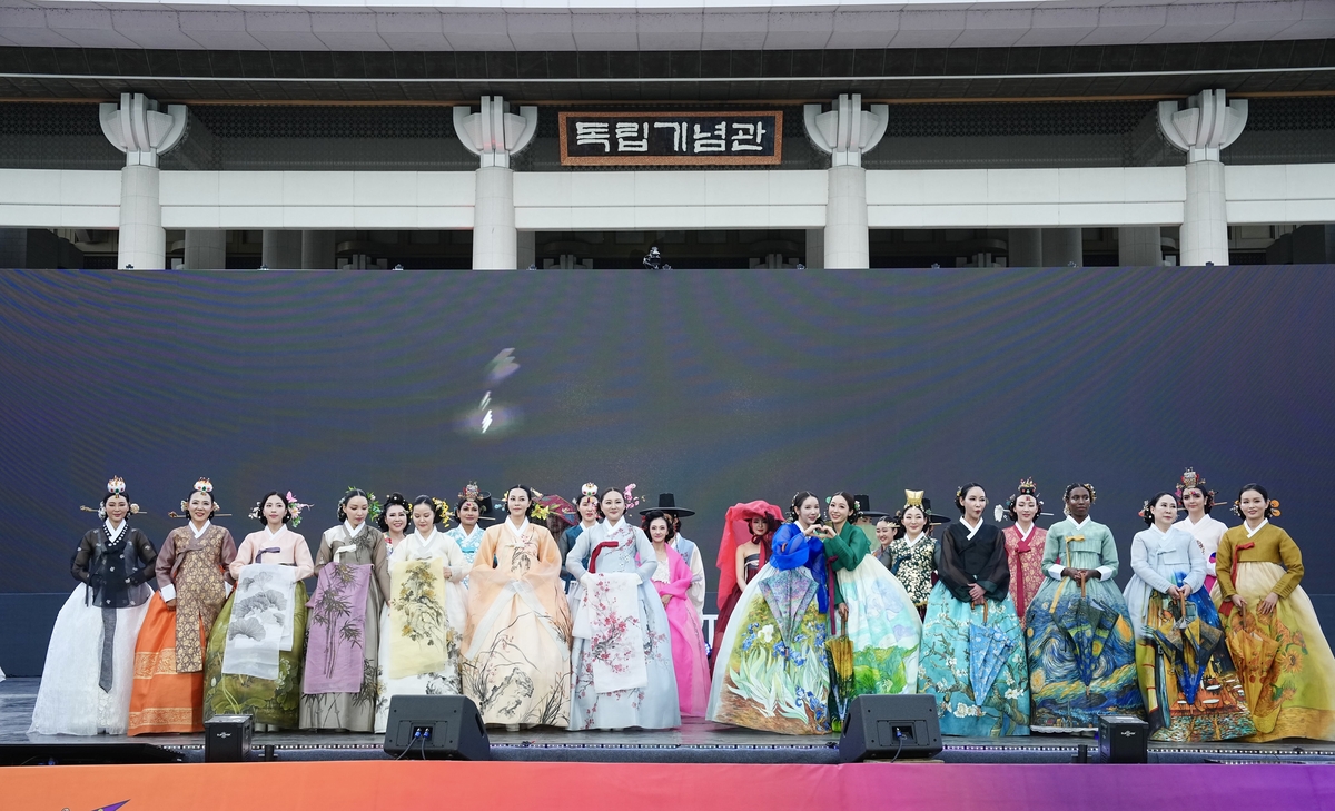 지난 5일 문화체육관광부 K-인플루언서, 코리아넷 명예기자단이 '2025 천안 K-컬처박람회' 장에서 한복을 입고 기념촬영하고 있다. [천안시 제공. 재판매 및 DB 금지]