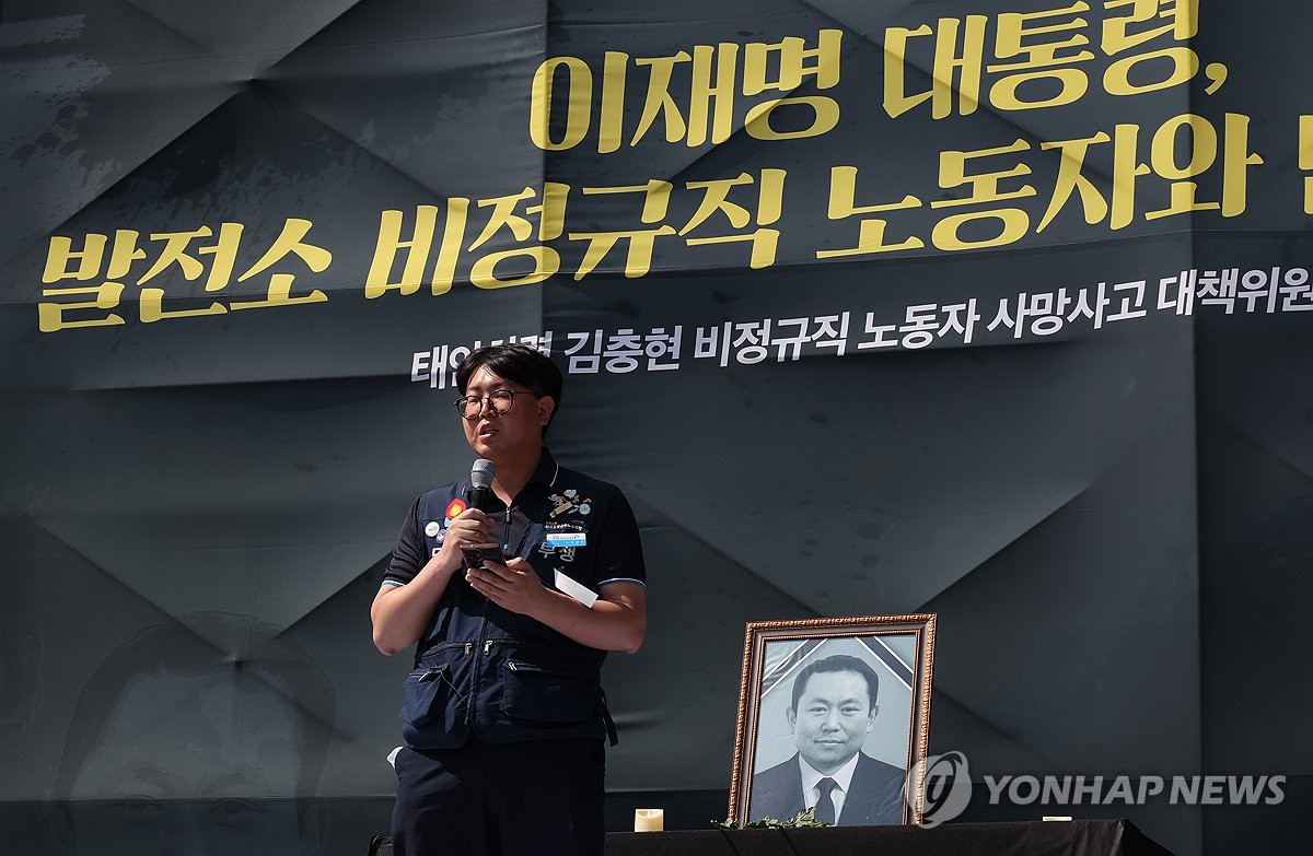 (서울=연합뉴스) 이진욱 기자 = 6일 서울역 부근에서 '태안화력 김충현 비정규직 노동자 사망사고 대책위원회'가 주최한 추모문화제에서 참석자가 발언하고 있다. 2025.6.6