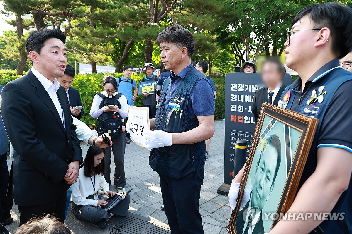 (서울=연합뉴스) 홍해인 기자 = 강훈식 대통령비서실장이 6일 서울 용산 대통령실 청사 인근 전쟁기념관 앞에서 태안화력발전소 사고 희생자 고(故) 김충현 씨와 관련해 엄길용 공공운수노조 위원장, 유족, 사고 대책위 관계자와 대화하고 있다. 2025.6.6 hihong@yna.co.kr
