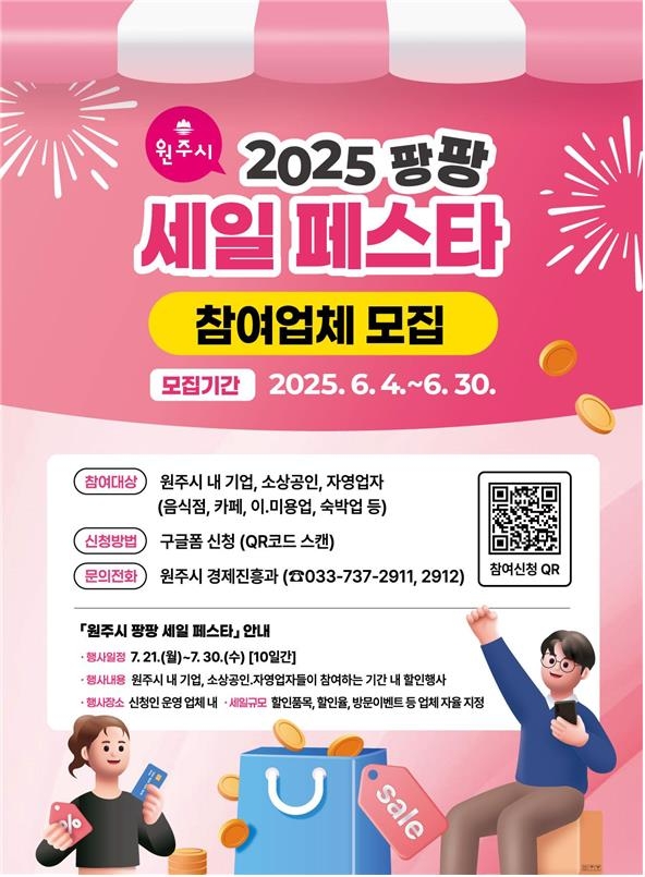 (원주=연합뉴스) 임보연 기자 = 원주시는 불황으로 위축된 소비심리를 회복하고 지역경제를 활성화하기 위해 오는 7월 21일부터 30일까지 '원주시 팡팡 세일 페스타'를 개최한다. 팡팡세일 페스타는 지역 다양한 업종의 기업, 소상공인, 자영업자 등이 참여해 할인을 진행하는 행사이다.