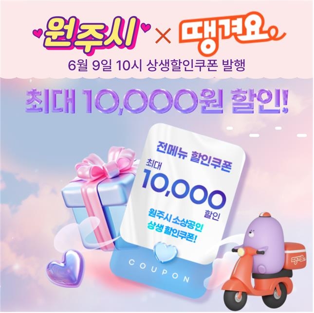 땡겨요 6월 할인쿠폰은 이날부터 예산소진 시까지 발행되며, 앱을 통해 원주 시내 가맹점에서 주문 시 사용할 수 있다.