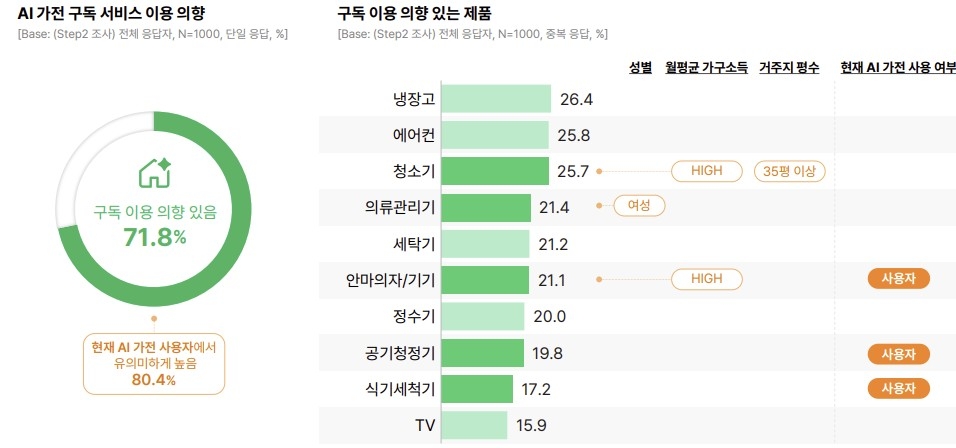 전체 응답자 중 구독 서비스 이용 의사가 있는 응답자는 71.8%였으며, 현재 AI 가전 사용자에게서는 80.4%로 더 높은 것으로 나타났다.