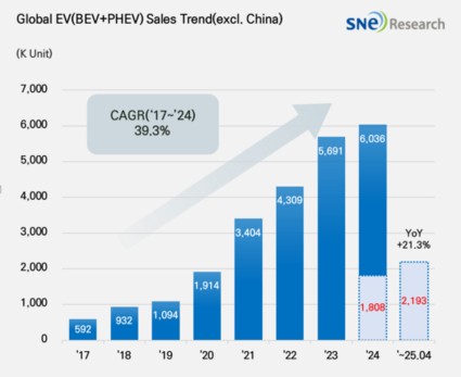 10일 시장조사업체 SNE리서치에 따르면 올해 1∼4월 중국 외의 세계 각국에 등록된 전기차(플러그인하이브리드차 포함)는 약 219만3천대로 작년 동기보다 21.3% 증가했다.