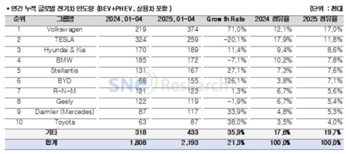 그룹별로는 폭스바겐그룹이 71% 증가한 37만4천대로 지난해 1위였던 테슬라를 제치고 선두를 차지했다.