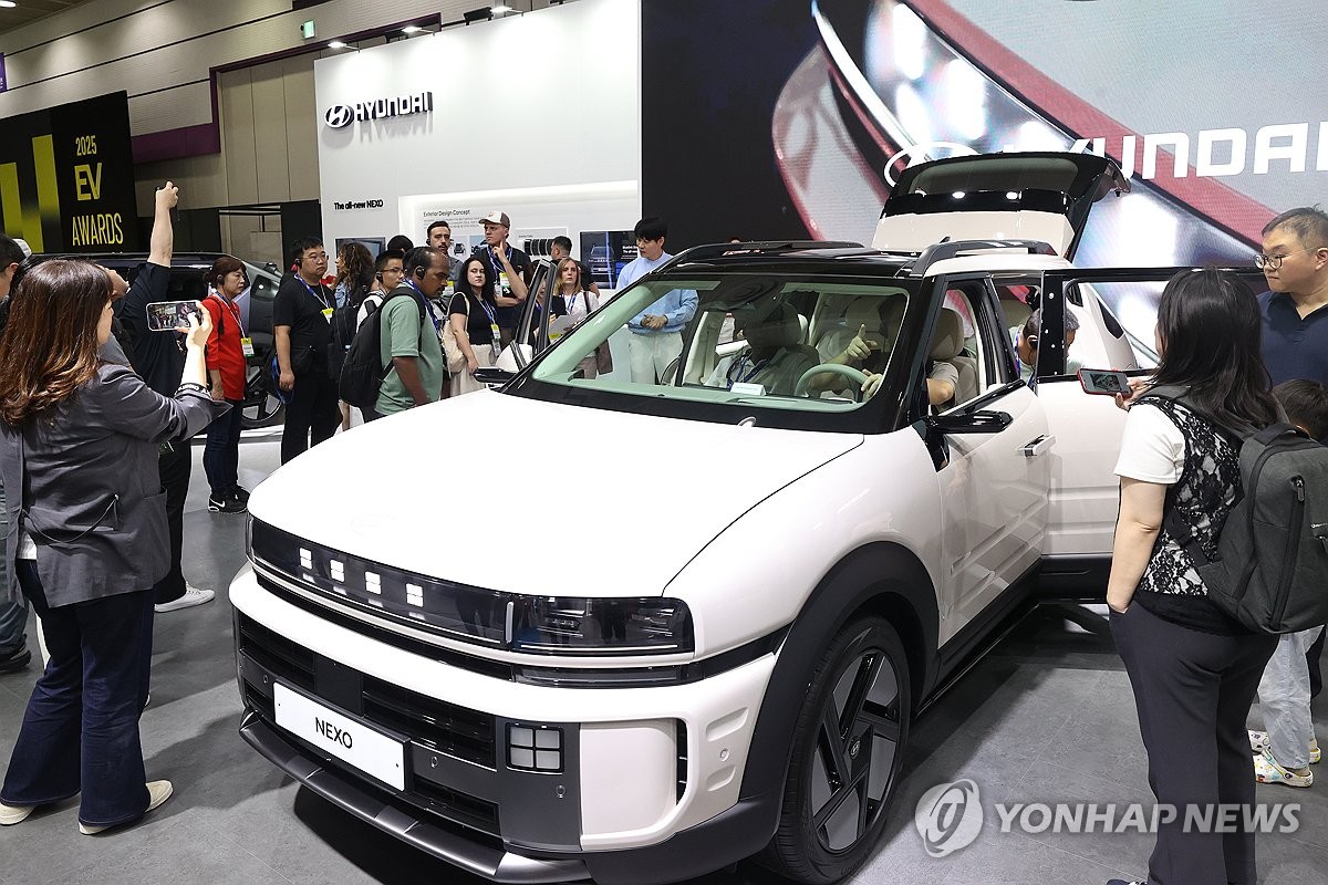 지난 3일 서울 강남구 코엑스에서 열린 전기차 혁신 기술 전시회 'EV 트렌드 코리아 2025'에서 외국인 참관객들이 현대자동차 부스를 둘러보고 있다. [연합뉴스 자료사진]