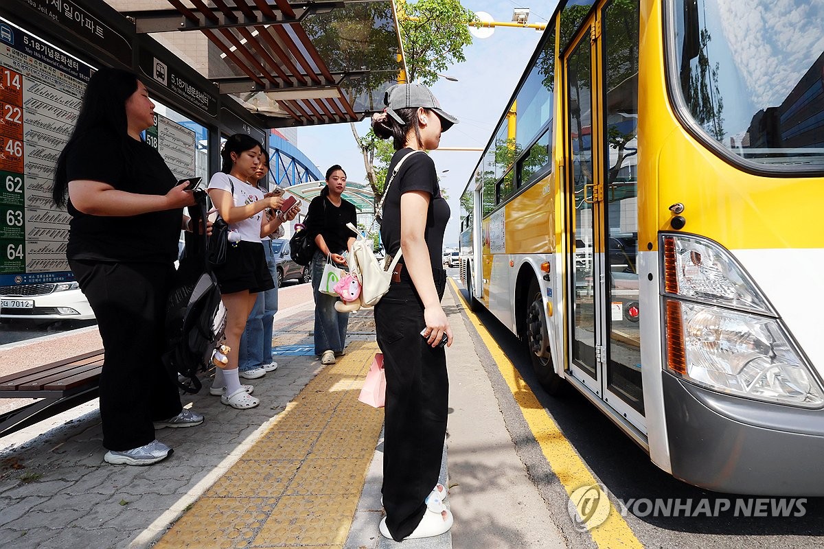 (광주=연합뉴스) 정다움 기자 = 광주 시내버스 노조가 파업을 재개한 지 이틀째인 10일 오전 광주 서구 쌍촌동 한 버스정류장에서 시민들이 버스에 올라타고 있다. 2025.6.10 daum@yna.co.kr