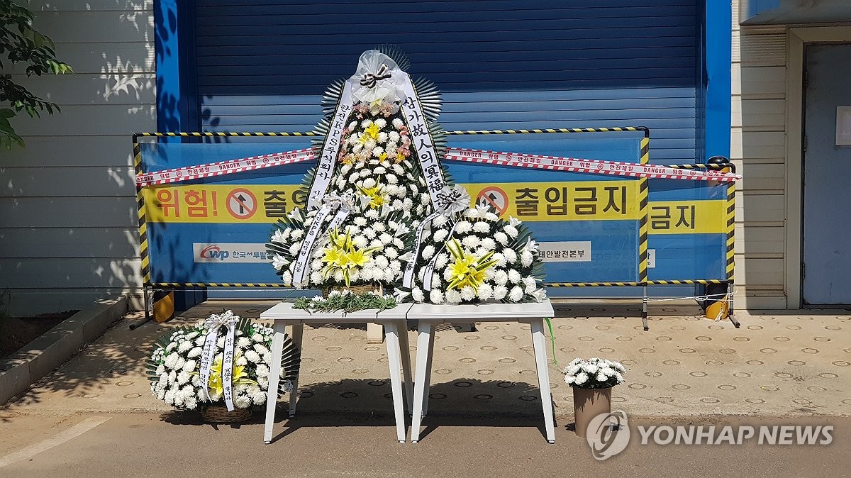 (태안=연합뉴스) 정윤덕 기자 = 3일 오후 충남 태안군 태안화력발전소 내 한전KPS 태안화력사업소 앞에 전날 작업 중 사망한 한전 KPS 하청업체 소속 비정규직 노동자 김충현(50) 씨를 기리는 근조 화환이 놓여 있다. 김씨는 전날 오후 기계공작실에서 작업하다 끼임 사고로 숨졌다. 2025.6.3 cobra@yna.co.kr