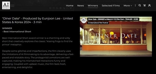 매월 열리는 이 영화제는 전 세계의 AI 영화제작자가 경쟁하는 꿈의 무대다. 그곳에서 나의 단편 영화 'Diner Date'는 '최우수 국제 단편상'(Best International Short)을 수상했다.