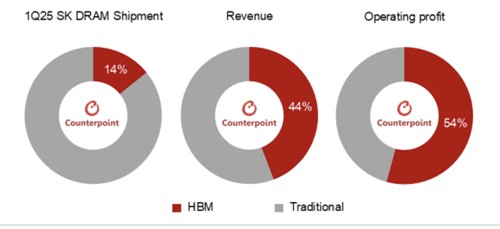 13일 글로벌 시장조사업체 카운터포인트리서치가 최근 발표한 '2025년 1분기 메모리 보고서'에 따르면 SK하이닉스의 전체 D램 출하량 중 HBM의 비중은 14%에 불과했으나, D램 매출과 영업이익에서 HBM이 차지한 비중은 각각 44%, 54%인 것으로 집계됐다.