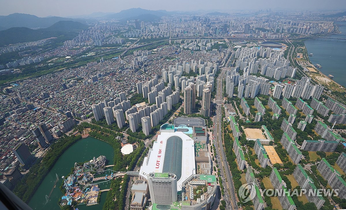 6일 KB국민은행에 따르면 지난달 서울 주택 평균 매매가는 10억398만원을 기록했다. 이는 KB국민은행 주택 가격 조사 시작 이래로 역대 최고가이자 사상 첫 10억원 돌파 기록이다. 사진은 6일 서울 송파구 롯데월드타워에서 바라본 주택단지 모습. 2025.6.6 superdoo82@yna.co.kr