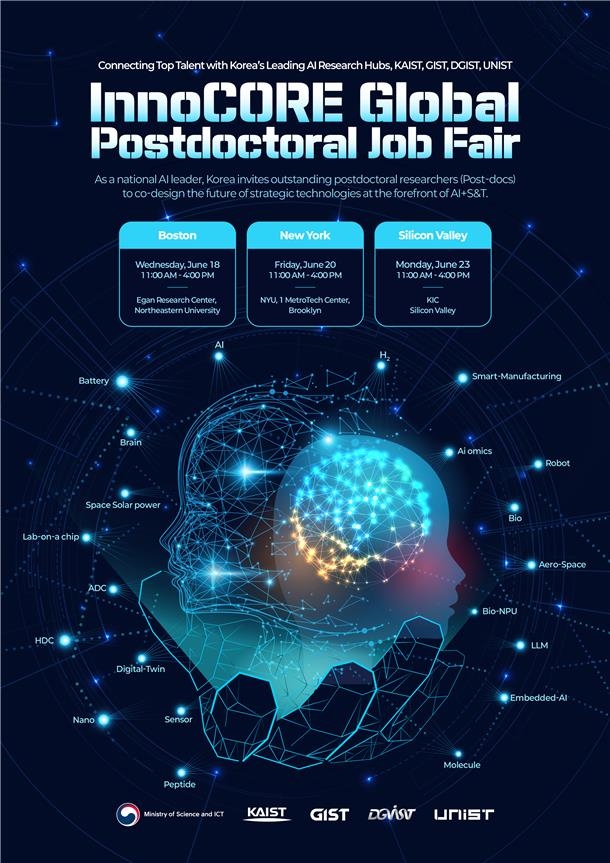 과학기술정보통신부와 4대 과학기술원은 AI 융합 분야 '이노코어 연구단' 8개를 선정하고 국내외 박사후연구원 400명 채용에 나선다고 15일 밝혔다.