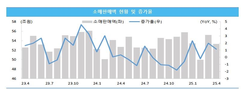25일 중소벤처기업연구원의 'KOSI 중소기업 동향' 6월호에 따르면 지난 4월 중소기업 소매판매액은 53조3천억원으로 지난해 같은 달보다 1.1% 증가했다.