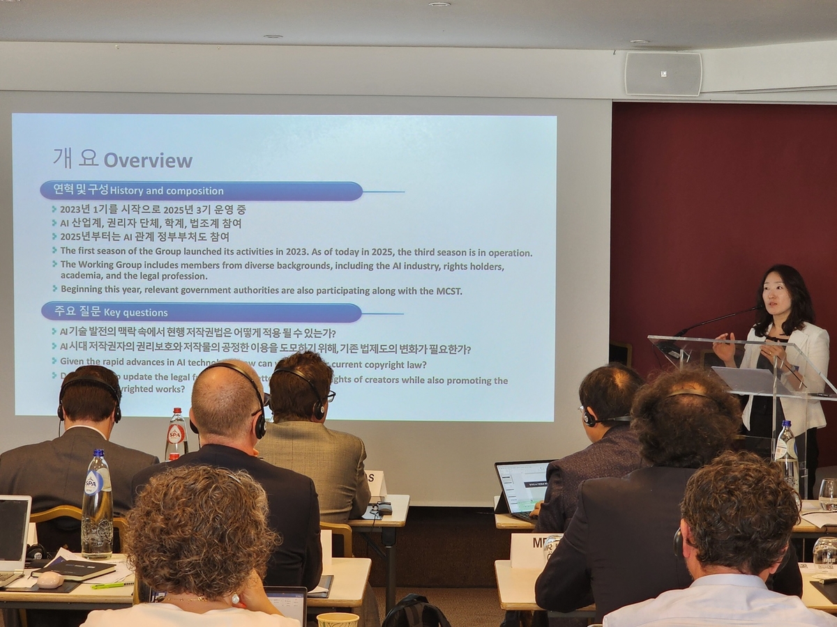 (서울=연합뉴스) 문화체육관광부 문화통상협력과 최혜윤 사무관이 25일 '한-유럽연합 생성형 인공지능과 저작권 세미나'에서 한국의 생성형 인공지능 관련 저작권 정책 경과를 소개하고 있다. 2025.06.25 [문화체육관광부 제공. 재판매 및 DB 금지]