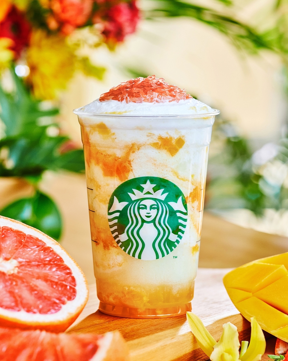자몽 망고 코코 프라푸치노는 코코넛 베이스에 망고와 자몽 맛을 낸 무카페인 음료다.