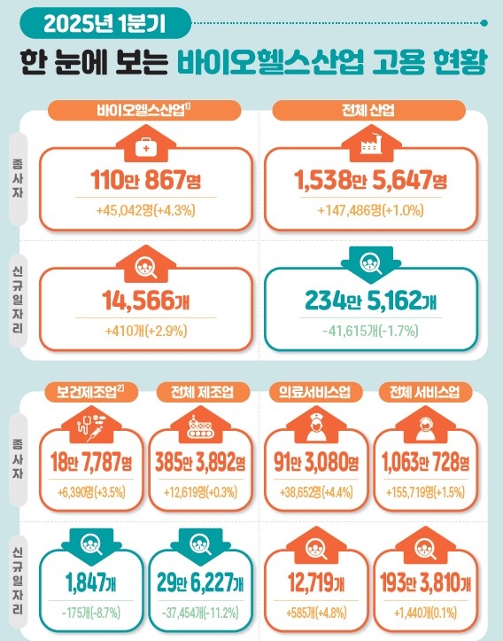 한국보건산업진흥원이 27일 발표한 2025년 1분기 바이오헬스산업 고용 동향에 따르면 1분기 바이오헬스 종사자는 110만867명으로, 작년 같은 기간보다 4.3% 증가했다. 전체 산업 종사자 증가율은 1.0%였다.
