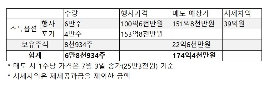 취임시 스톡옵션 행사물량과 보유주식 등 6만8천934주 전량 매각하기로