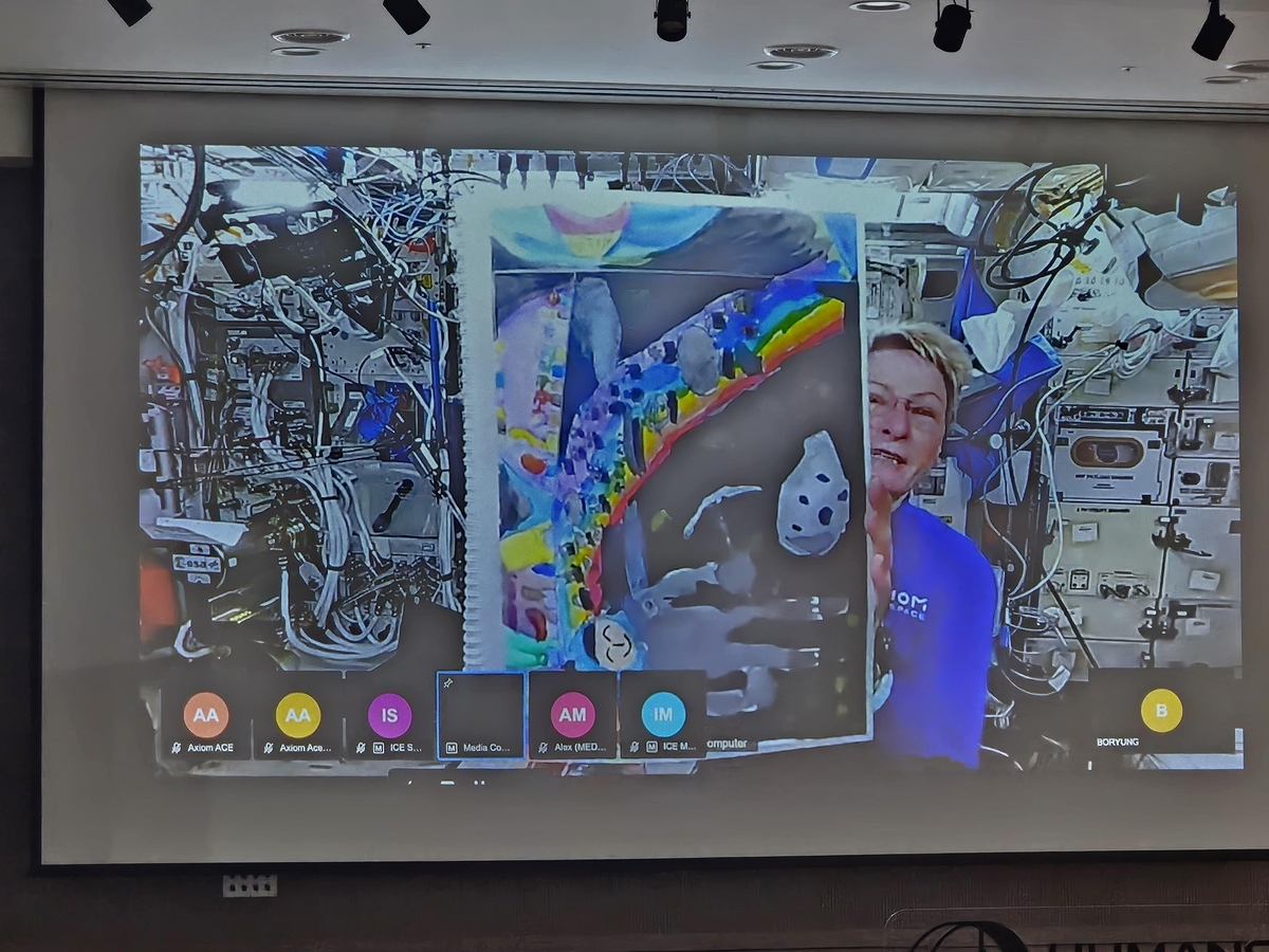 5일 서울 서대문구 연세대 미래교육원 대강당, 대형 화면 너머로 국제우주정거장(ISS)에서 미국 우주기업 액시엄스페이스의 민간 우주임무 'AX-4'를 이끄는 페기 윗슨 사령관이 한 그림을 손에 든 채 펼쳐 보이며 이같이 소개했다.