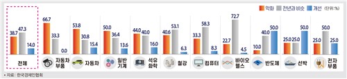 업종별로 살펴보면 자동차 부품(66.7%), 자동차(53.8%), 일반기계(50%), 석유화학(44%), 철강(40.6%) 등 7개 업종에서 '채산성 악화' 응답 비중이 '개선'보다 높았다. 전자부품은 개선·악화 전망 비율이 각 25%로 같았고 반도체(10%), 선박(25%) 2개 업종만 '개선' 응답 비중이 더 높았다.