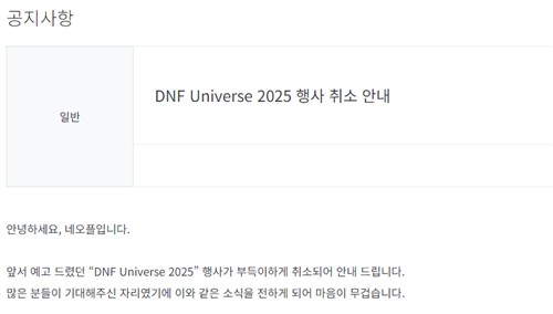 15일 게임업계에 따르면 네오플은 8월 진행 예정이던 '던전앤파이터' 시리즈 종합 축제 'DNF 유니버스 2025' 행사를 취소한다고 전날 저녁 주요 게임 홈페이지를 통해 공지했다.