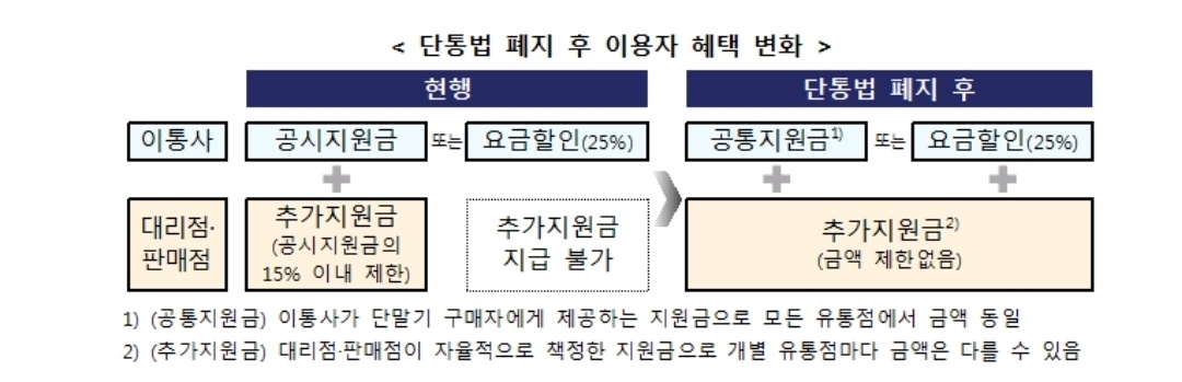또 단통법 폐지 후에도 이동통신사와 유통점은 이용자의 거주지역·나이·신체적 조건에 따라 지원금을 차별해서는 안 된다.