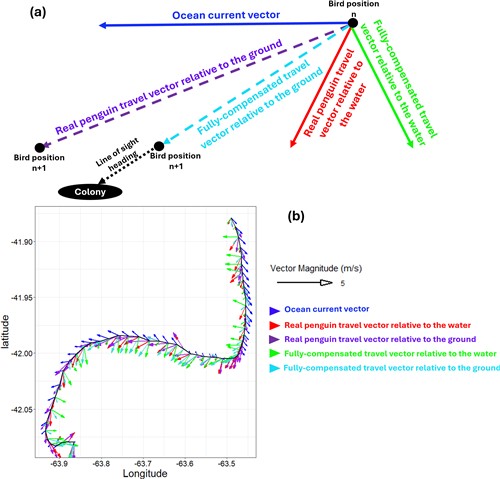 (a) 지점 n의 해류 벡터(진한 파란색 실선), 펭귄의 수중 이동 벡터(빨간색 실선), 완전히 보정된 수중 이동 벡터(초록색 실선). 지점 n+1의 펭귄 지면 기준 이동 벡터(보라색 점선)와 완전히 보정된 지면 기준 이동 벡터(하늘색 점선). 검은색 점선 화살표는 서식지 방향 직선 경로. (b) 한 펭귄의 이동 경로를 5분 단위로 계산한 모습. [PLOS Biology / Richard M. Gunner et al. 제공. 재판매 및 DB 금지]