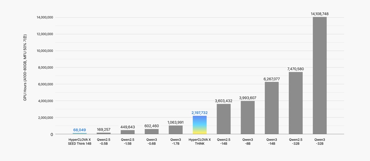해당 모델은 140억개 파라미터 규모 모델이지만, 5억개 파라미터로 구성된 글로벌 오픈소스 모델보다 더 적은 비용으로 학습됐다고 회사 측은 설명했다. 동일 크기 모델과 비교하면 1회 학습 비용이 약 100분의 1 수준이다.