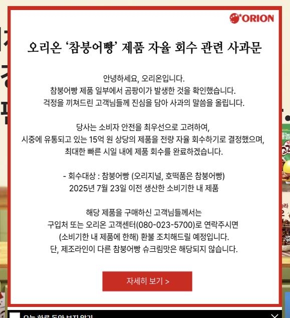 오리온 홈페이지에서도 사과문과 제품 회수 공지를 볼 수 있다.