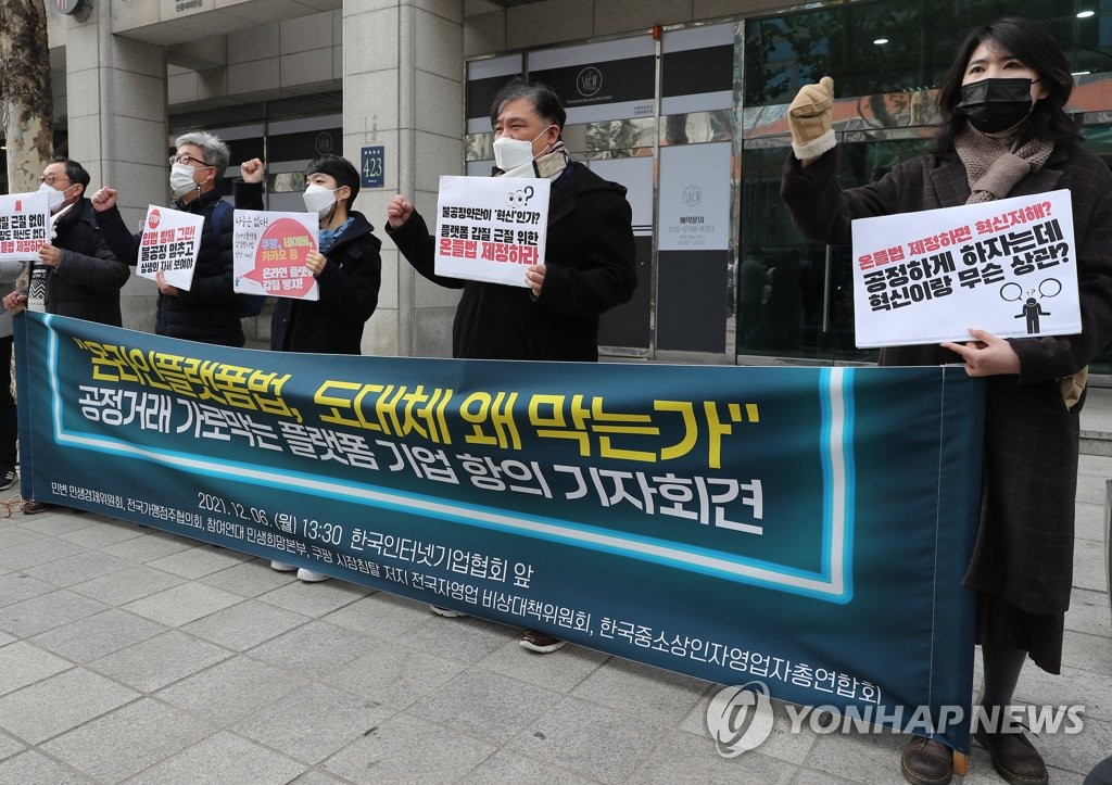 (서울=연합뉴스) 류효림 기자 = 참여연대 관계자들이 6일 서울 강남구 삼성동 한국인터넷기업협회 앞에서 열린 공정거래 가로막는 플랫폼 기업 항의 기자회견에서 온라인플랫폼법 제정을 촉구하고 있다. 2021.12.6 ryousanta@yna.co.kr