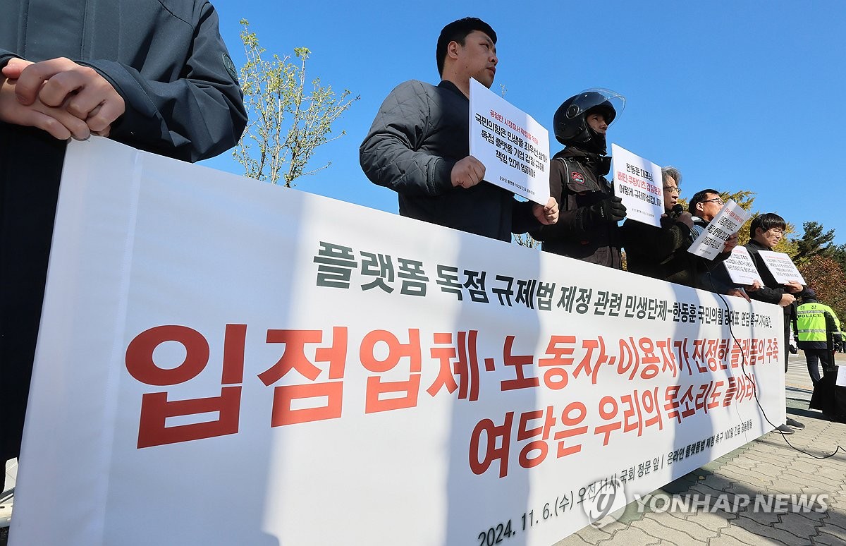 (서울=연합뉴스) 이정훈 기자 = 온라인플랫폼법제정촉구100일긴급공동행동 관계자들이 6일 오전 국회 앞에서 국민의힘 한동훈 대표에게 플랫폼 독점 규제법 제정 관련 면담을 촉구하는 기자회견을 하고 있다. 2024.11.6 uwg806@yna.co.kr