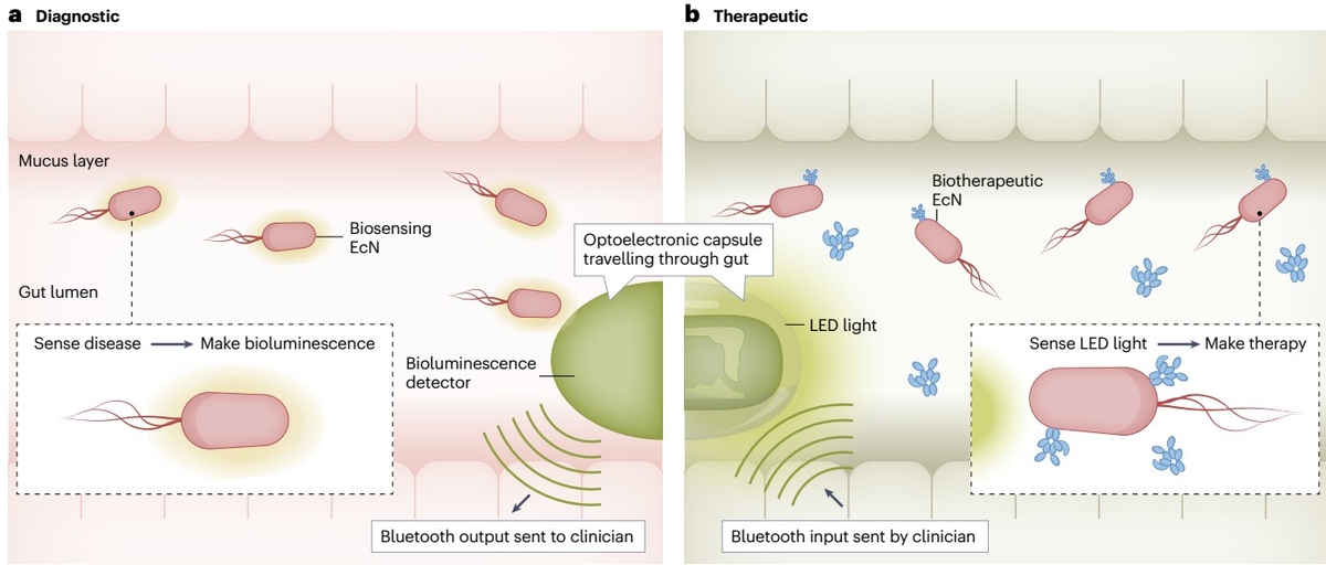 (a) 질병 진단 : 유전자 조작 박테리아는 질병 신호(염증물질 등)를 감지하면 빛을 내며, 광전자 캡슐은 이를 감지해 블루투스로 정보를 스마트폰에 전달한다. (b) 질병 치료 : 의료진이 신호를 보내 캡슐 내부 LED 불빛이 켜지게 하면 박테리아 내부의 광 감응 유전자가 활성화돼 항염증 나노항체를 분비한다. [Nature Microbiology, Taofeng Du et al. 제공. 재판매 및 DB 금지]