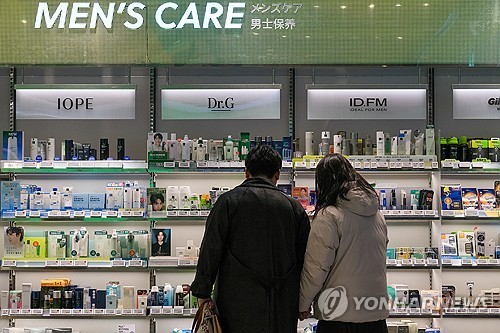 (서울=연합뉴스) 류효림 기자 = 7일 서울 중구 명동의 한 화장품 판매점에서 방문객들이 피부관리 제품을 살펴보고 있다. 최근 들어 외모를 가꾸는 데 관심을 갖는 남성들이 증가하면서 국내 화장품업계가 남성 화장품 포트폴리오를 강화하며 수익 창출을 꾀하고 있다. 시장 조사 회사인 유로모니터에 따르면 2022년 기준 연간 남성 스킨케어 소비액은 한국이 1인당 9.6달러로 전 세계에서 가장 많았다. 2024.1.7