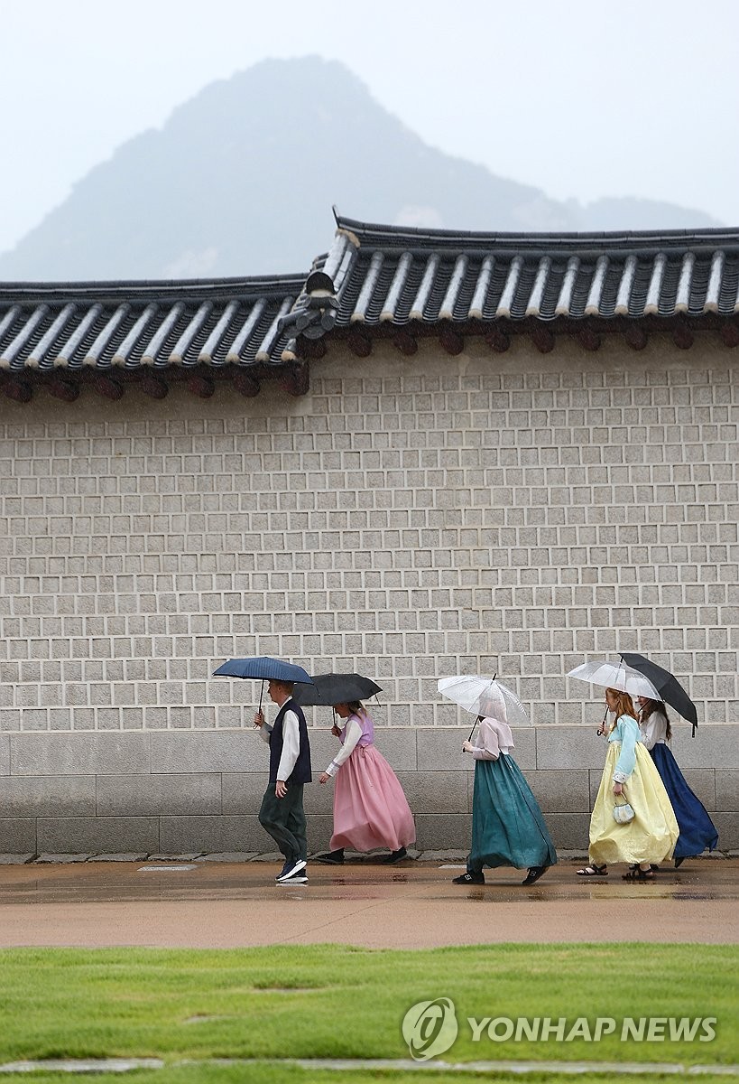 (서울=연합뉴스) 김성민 기자 = 비가 내린 16일 서울 종로구 경복궁에서 외국인 관광객들이 이동하고 있다. 2025.7.16 ksm7976@yna.co.kr