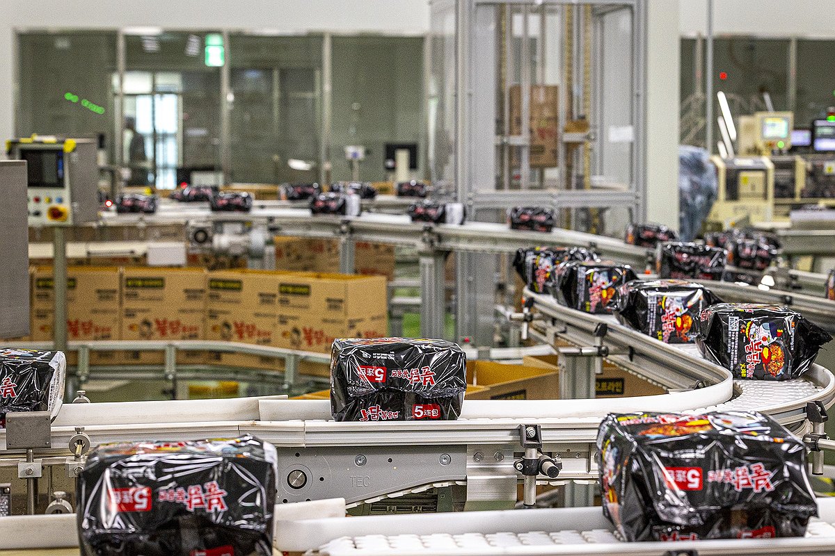 (서울=연합뉴스) 삼양식품이 세계 라면 시장 공략을 위한 '수출 전진기지'인 밀양 제2공장을 완공했다. 삼양식품은 11일 경남 밀양시 부북면 나노융합국가산업단지에서 밀양 2공장 준공식을 개최했다. 1공장에서는 중국으로 수출하는 불닭볶음면을 주로 만들고, 2공장에서는 미국과 유럽연합(EU) 등으로 보내는 까르보 불닭볶음면 위주로 생산한다는 방침이다. 사진은 삼양식품 밀양 1공장에서 생산된 불닭볶음면. 2025.6.11 [삼양식품 제공. 재판매 및 DB금지] photo@yna.co.kr