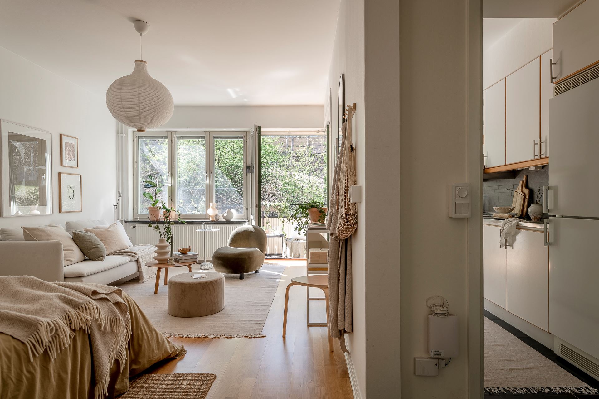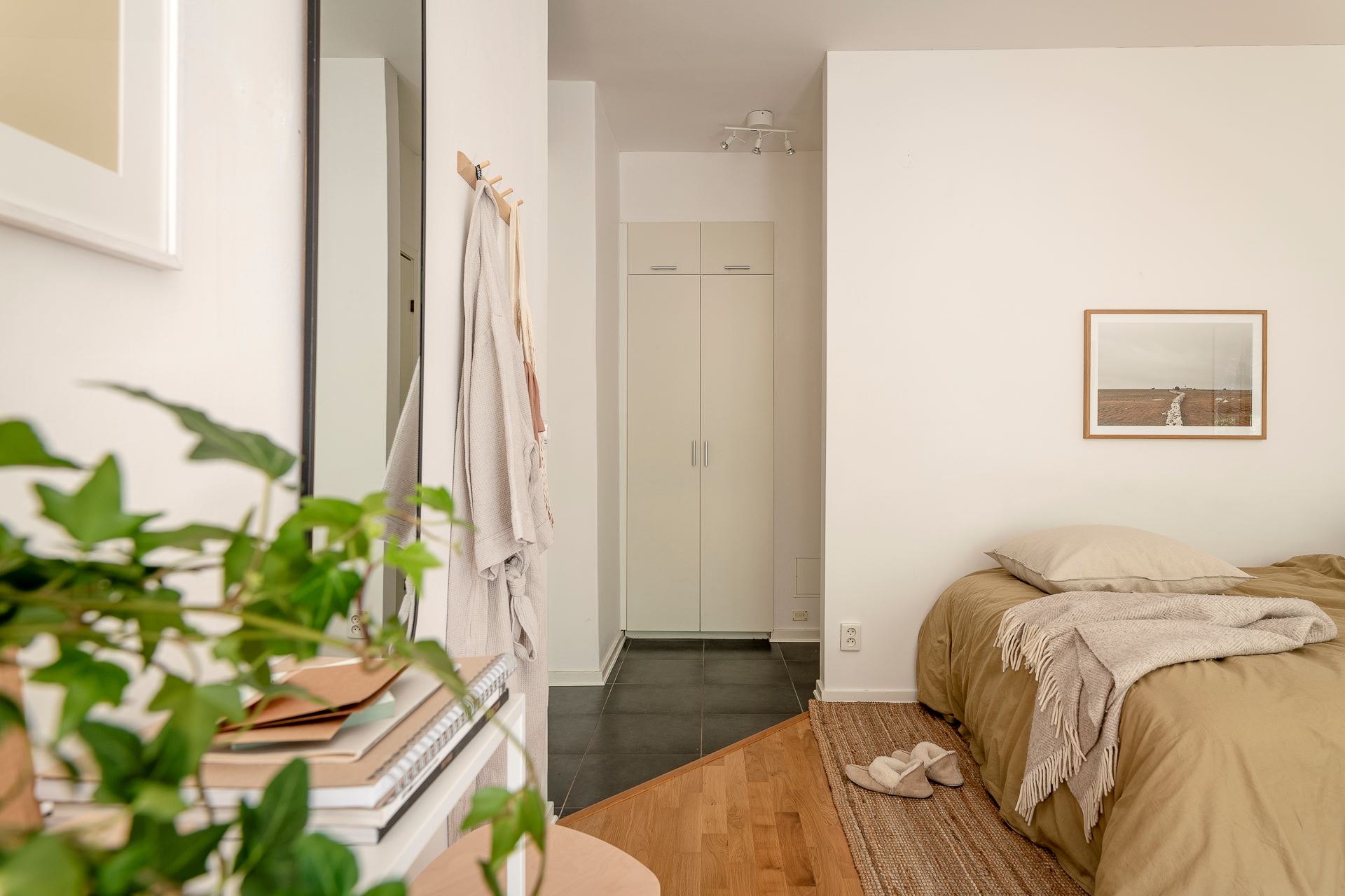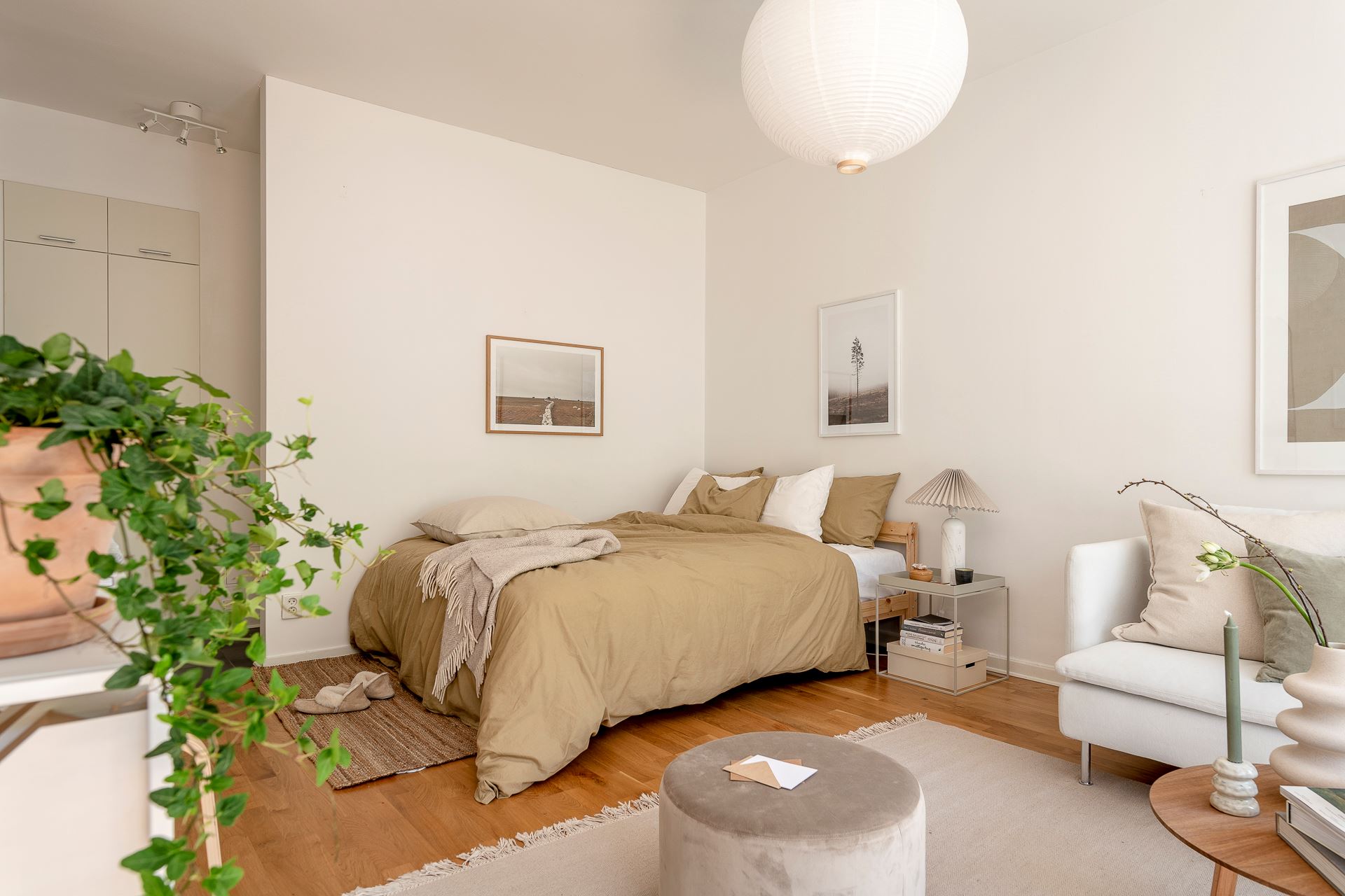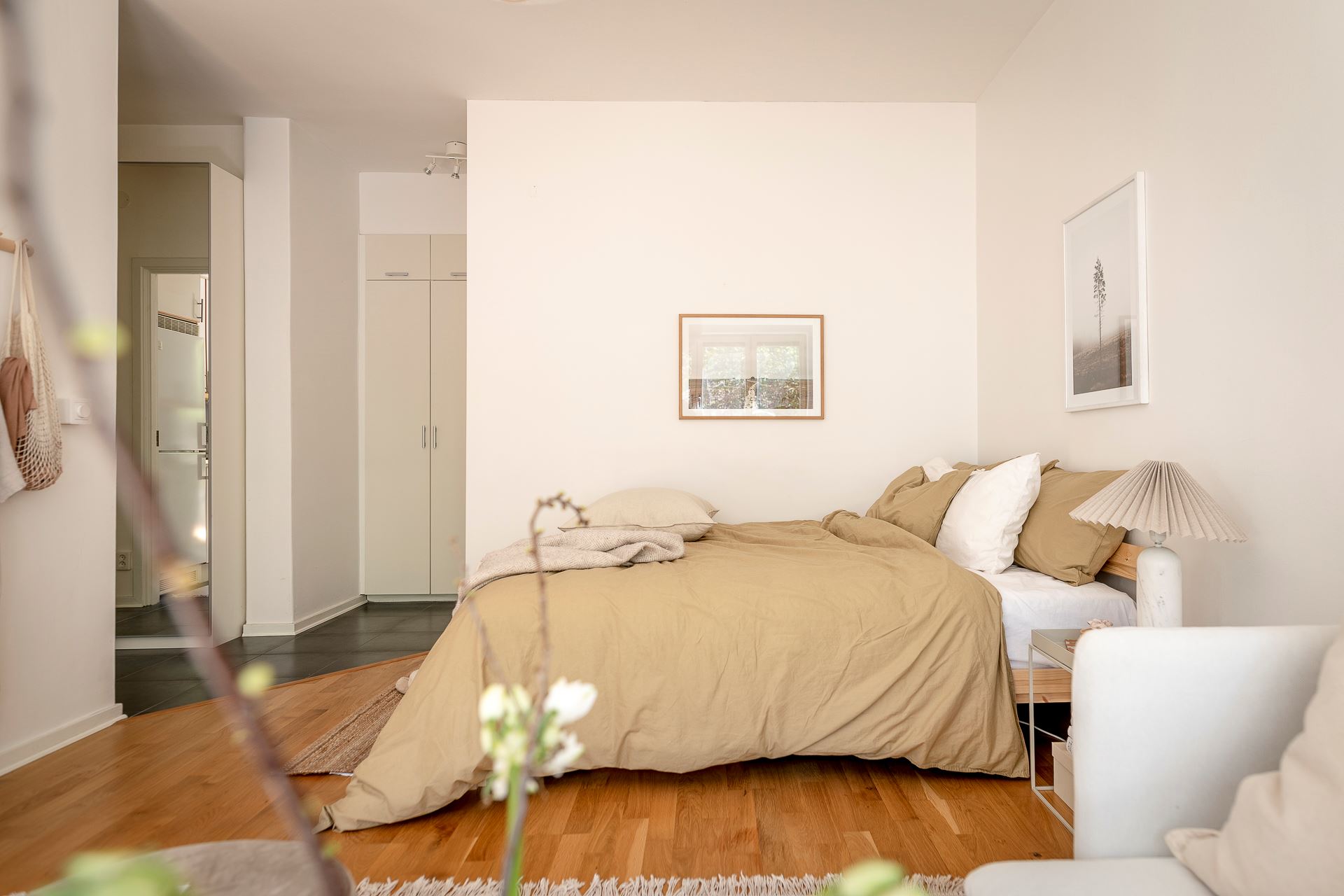 노르웨이의 페인트 브랜드 ‘요턴: Jotun’사의 <코코스: Kokos>와 화이트 컬러로 은은하게 칠해진 실내에 우드 플로어를 시공해 아늑한 분위기를 연출하고 있는 메인 공간은 거실과 침실을 겸하고 있는 집안의 중심 공간으로, 원룸을 비롯한 소형 주거 공간에 적용해 볼 수 있는 예쁜 인테리어로 눈길을 끈다.