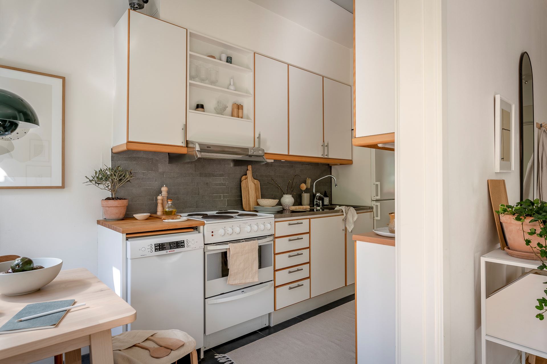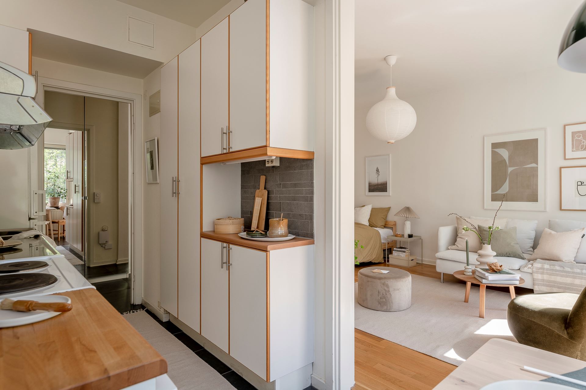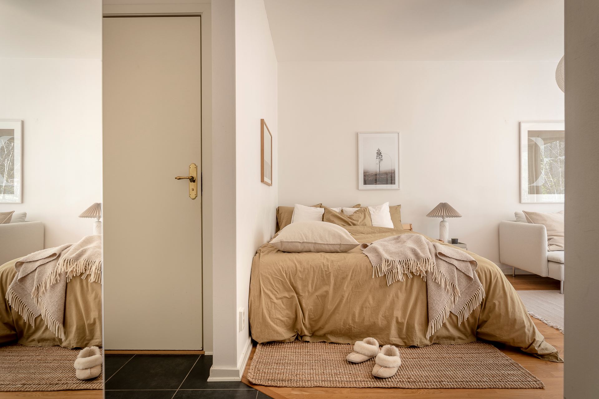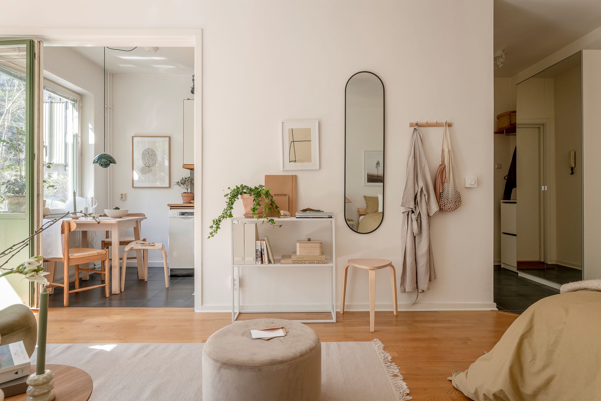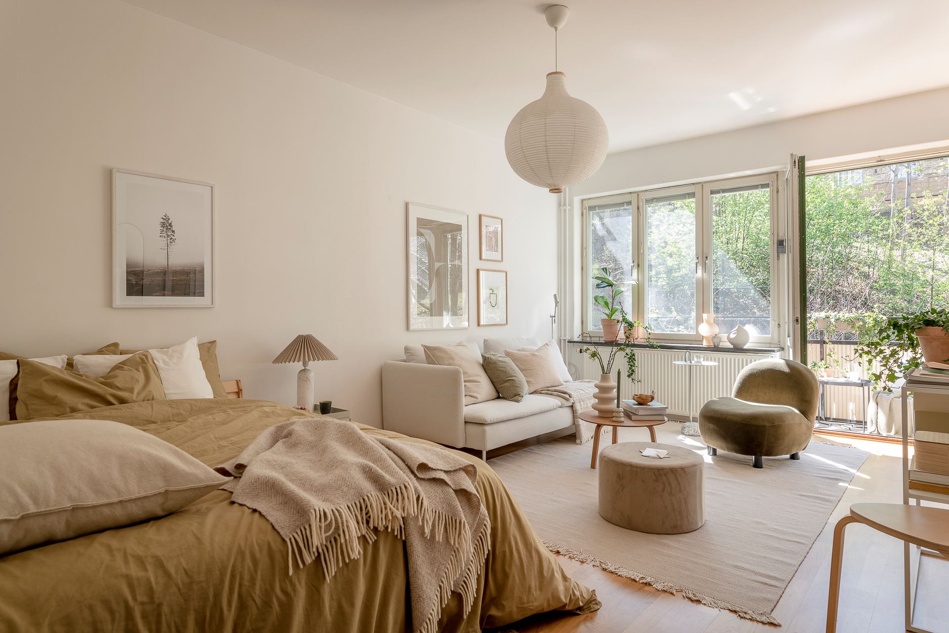 노르웨이의 페인트 브랜드 ‘요턴: Jotun’사의 <코코스: Kokos>와 화이트 컬러로 은은하게 칠해진 실내에 우드 플로어를 시공해 아늑한 분위기를 연출하고 있는 메인 공간은 거실과 침실을 겸하고 있는 집안의 중심 공간으로, 원룸을 비롯한 소형 주거 공간에 적용해 볼 수 있는 예쁜 인테리어로 눈길을 끈다.