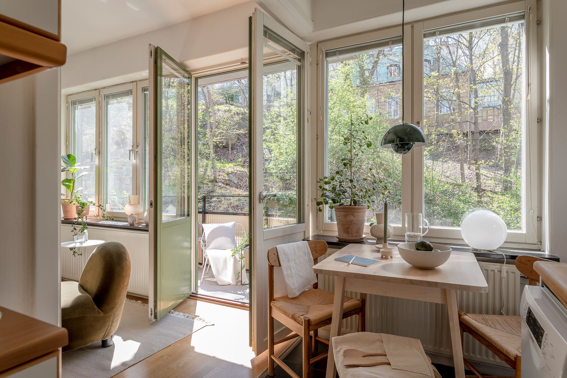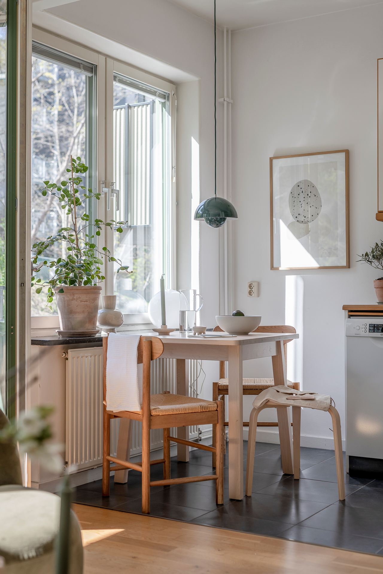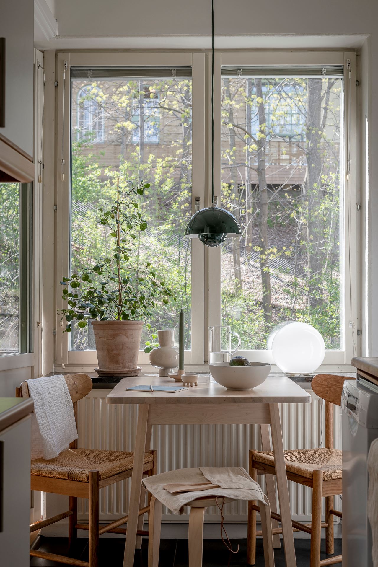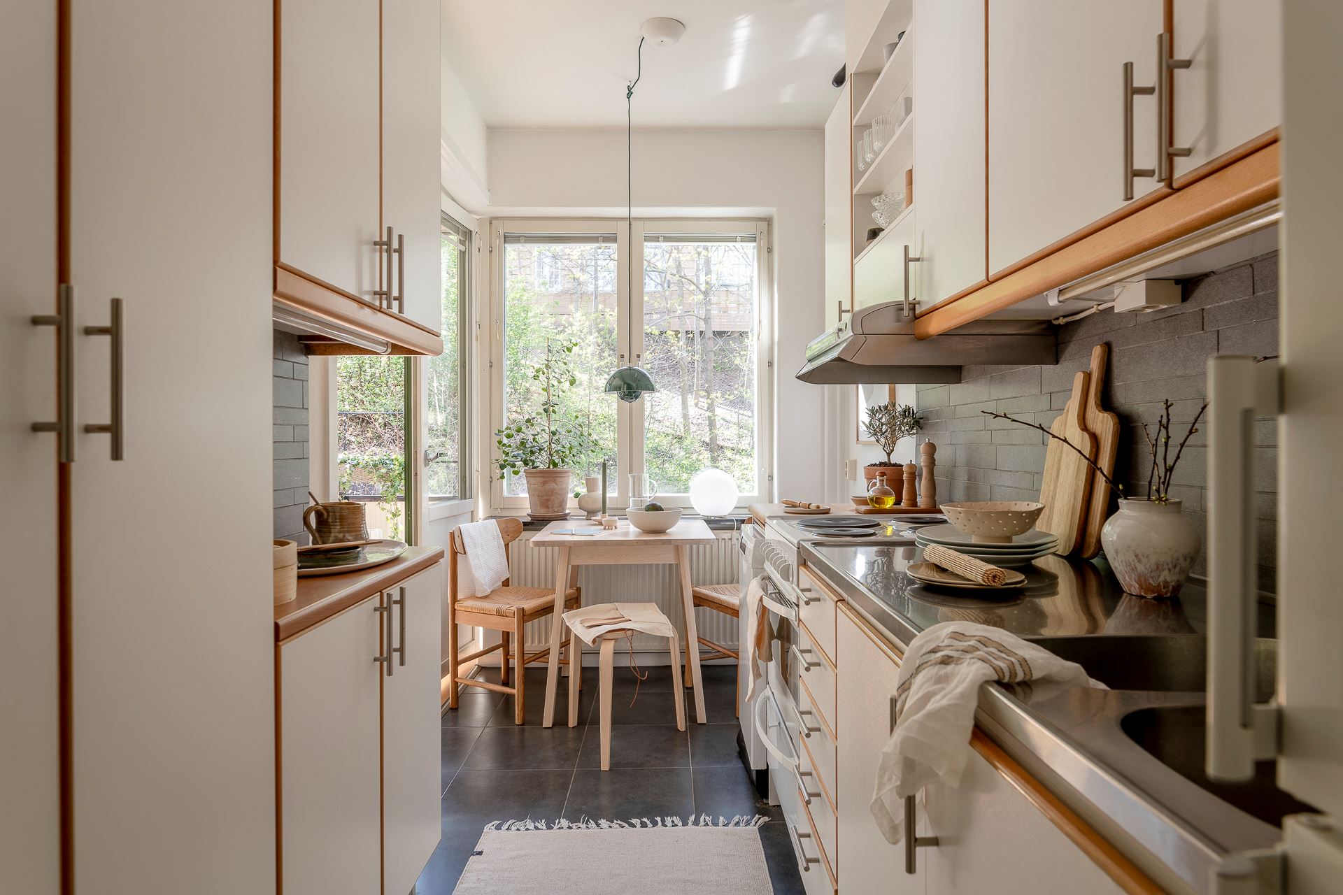 펜던트 조명으로 깜찍한 포인트를 준 주방 속 작은 다이닝 공간은 식사와 티타임을 즐길 수 있는 멋스러운 미니 홈 카페 겸 레스토랑으로 스타일링되어 일상의 여유와 낭만을 더하고 있다.