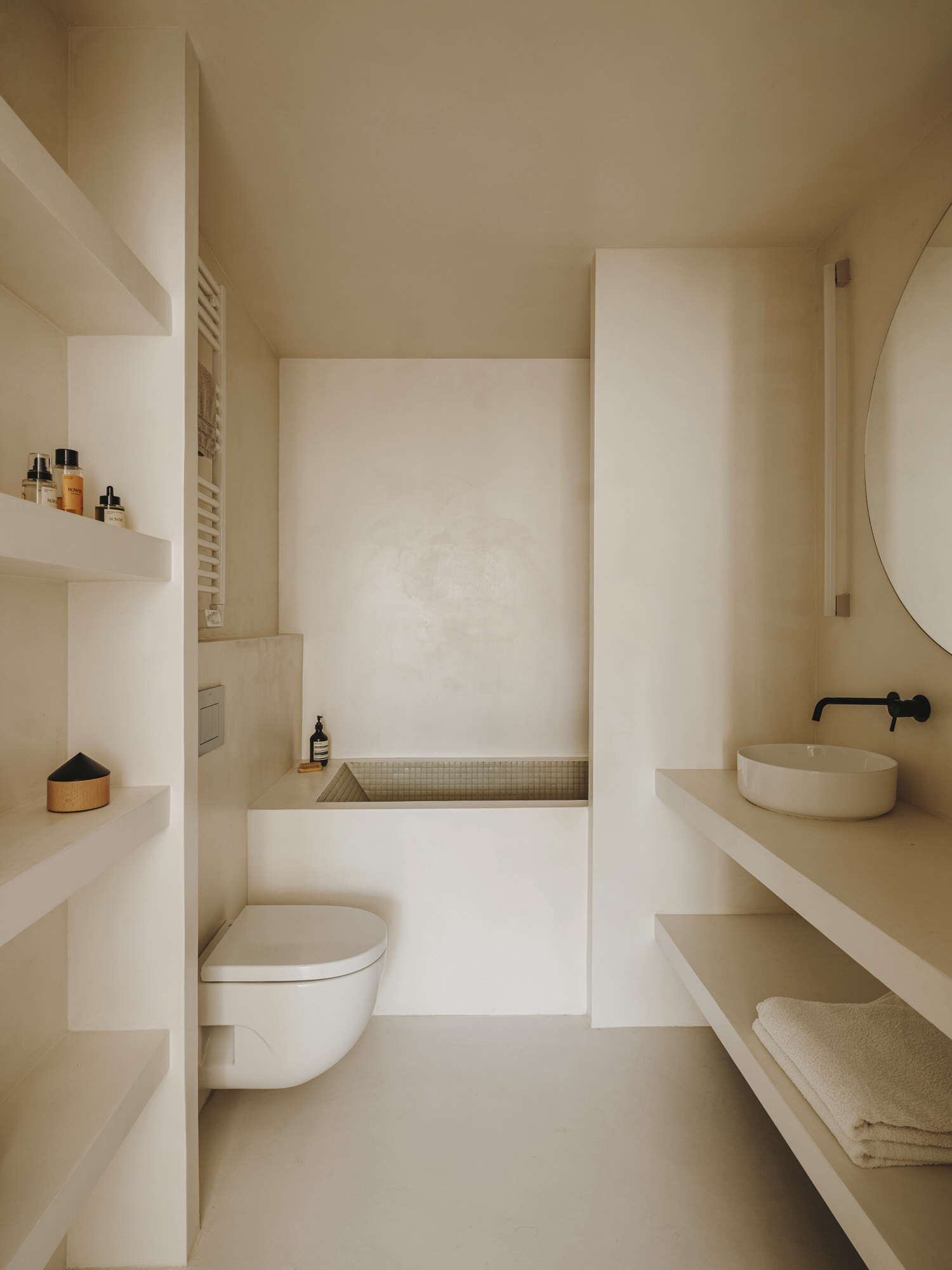 부드럽고 은은한 컬러 톤 안에 무척이나 효율적인 공간 설계와 군더더기 없이 깔끔하고 정갈하게 구성된 빌트인 수납공간의 완벽한 조화를 이루고 있는 욕실은 보는 이들에게 감탄을 불러일으키는 감각적인 욕실 인테리어로 눈길을 끈다.