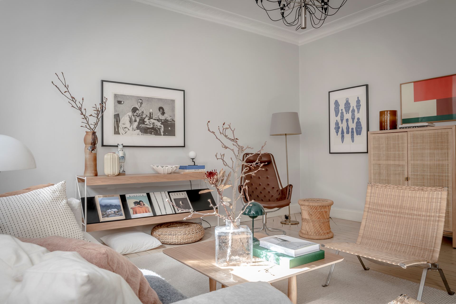두 개의 대형 창문을 통해 들어오는 따뜻한 햇살과 시원한 바람으로 밝고 쾌적한 공간을 유지하고 있는 거실에는 디자이너 가구와 조명, 오브제들을 감각적으로 배치해 우아하고 스타일리시한 노르딕 거실을 연출하고 있다.