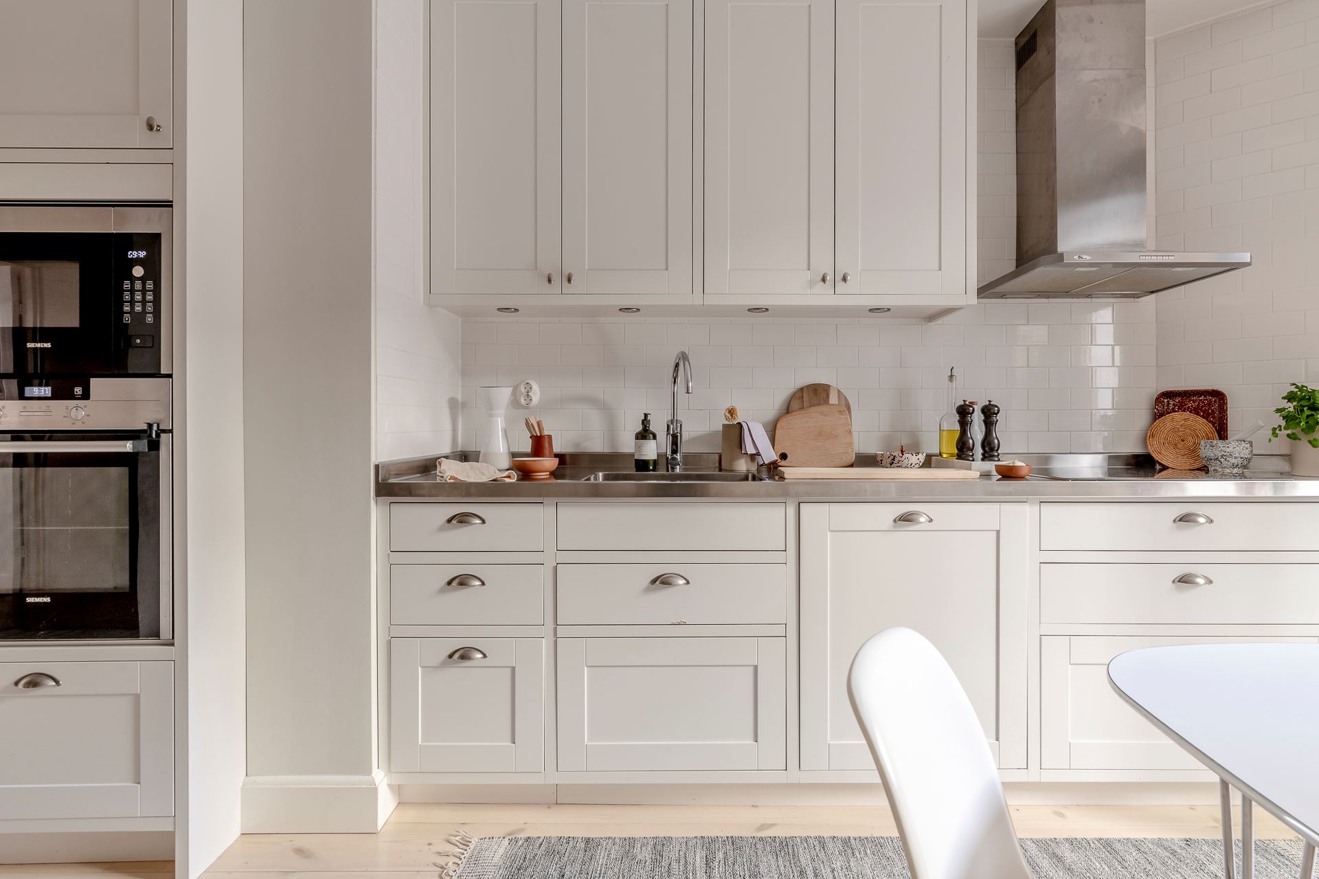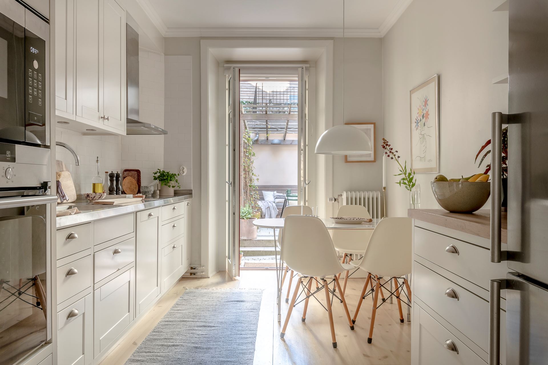 안뜰과 바로 이어져 우수한 통풍과 환기를 자랑하는 주방의 경우 화이트 타일로 백스플래쉬를 마감한 후, 공간에 꼭 맞춰 디자인된 화이트 빌트인 싱크대를 효율적인 동선에 맞춰 설치해 다양한 주방 공간에 쉽게 응용해 볼 수 있는 깔끔한 주방 인테리어를 잘 보여주고 있다.