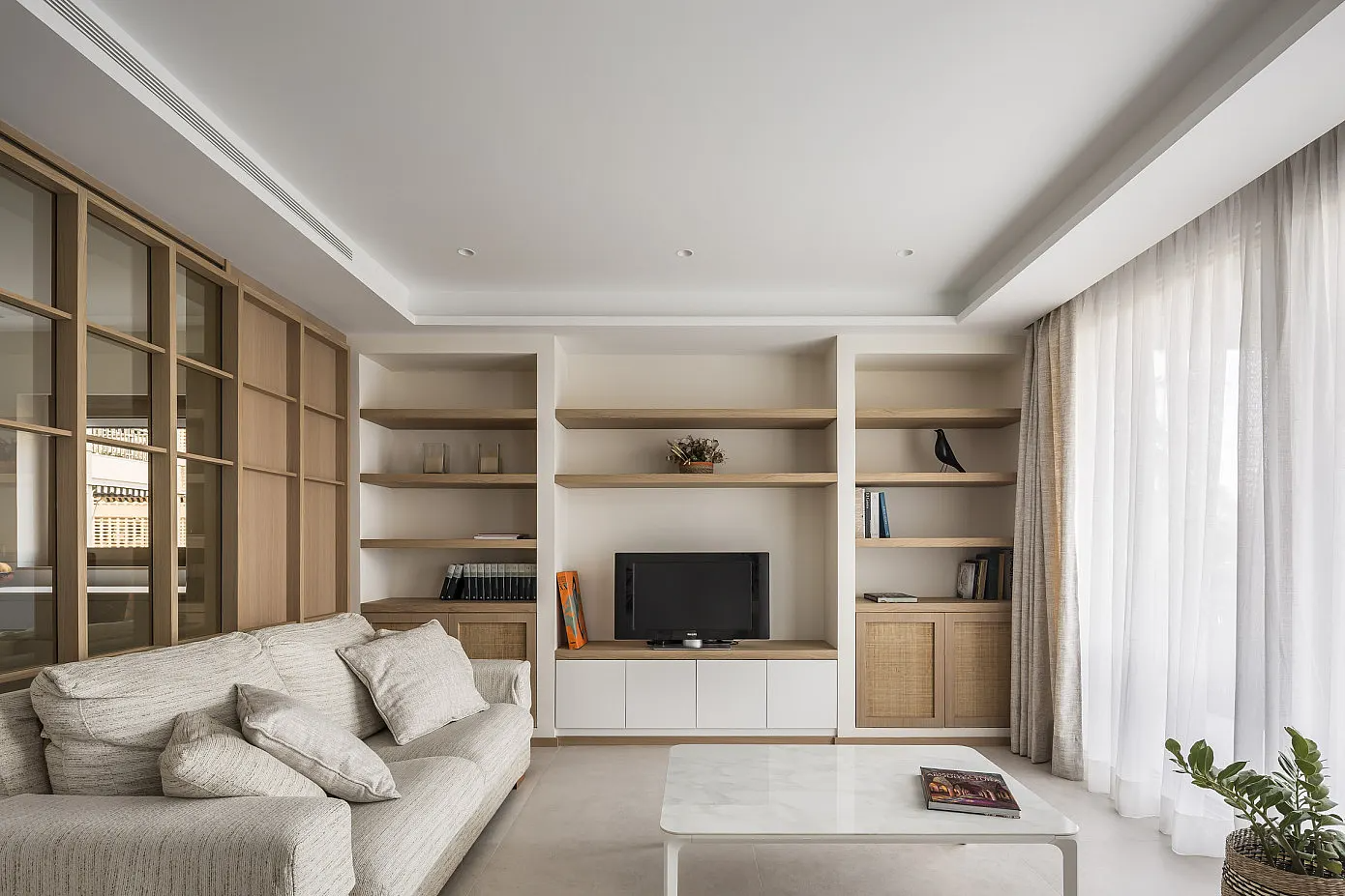 수납과 장식 공간으로 구성된 빌트인 선반장 겸 수납장이 깔끔하게 설치된 거실에는 소파와 커피 테이블, 스탠딩 조명 등을 단정하게 배치해 우아하고 품격 있는 거실 인테리어를 완성하고 있다.
