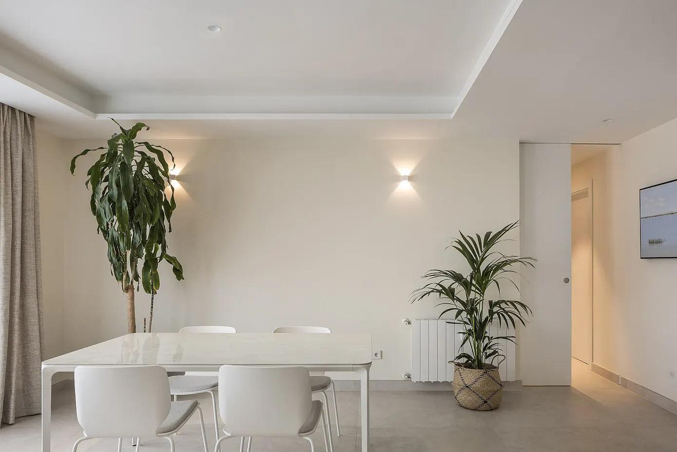 벽 조명으로 포인트를 준 오픈 다이닝룸에는 심플한 디자인의 화이트 다이닝 테이블 세트를 중앙에 배치하고 대형 화초로 싱그러움을 더해 깔끔하고 여유로운 다이닝 공간을 연출하고 있다.